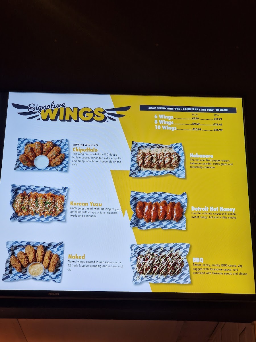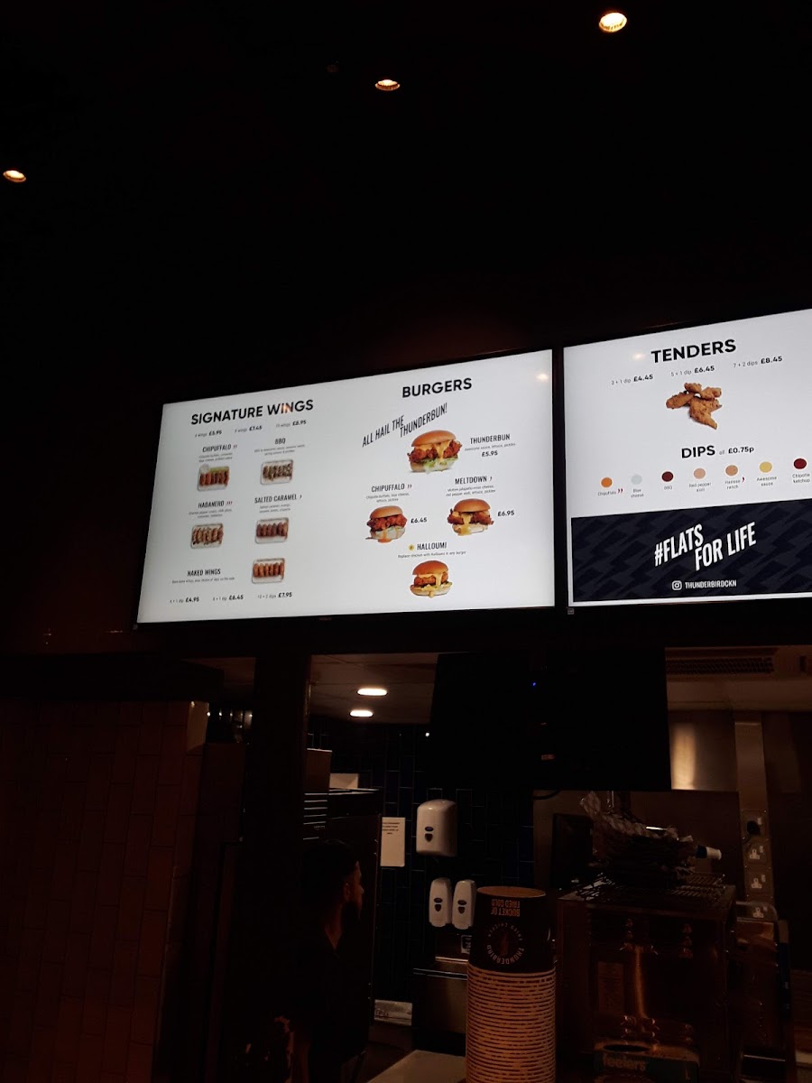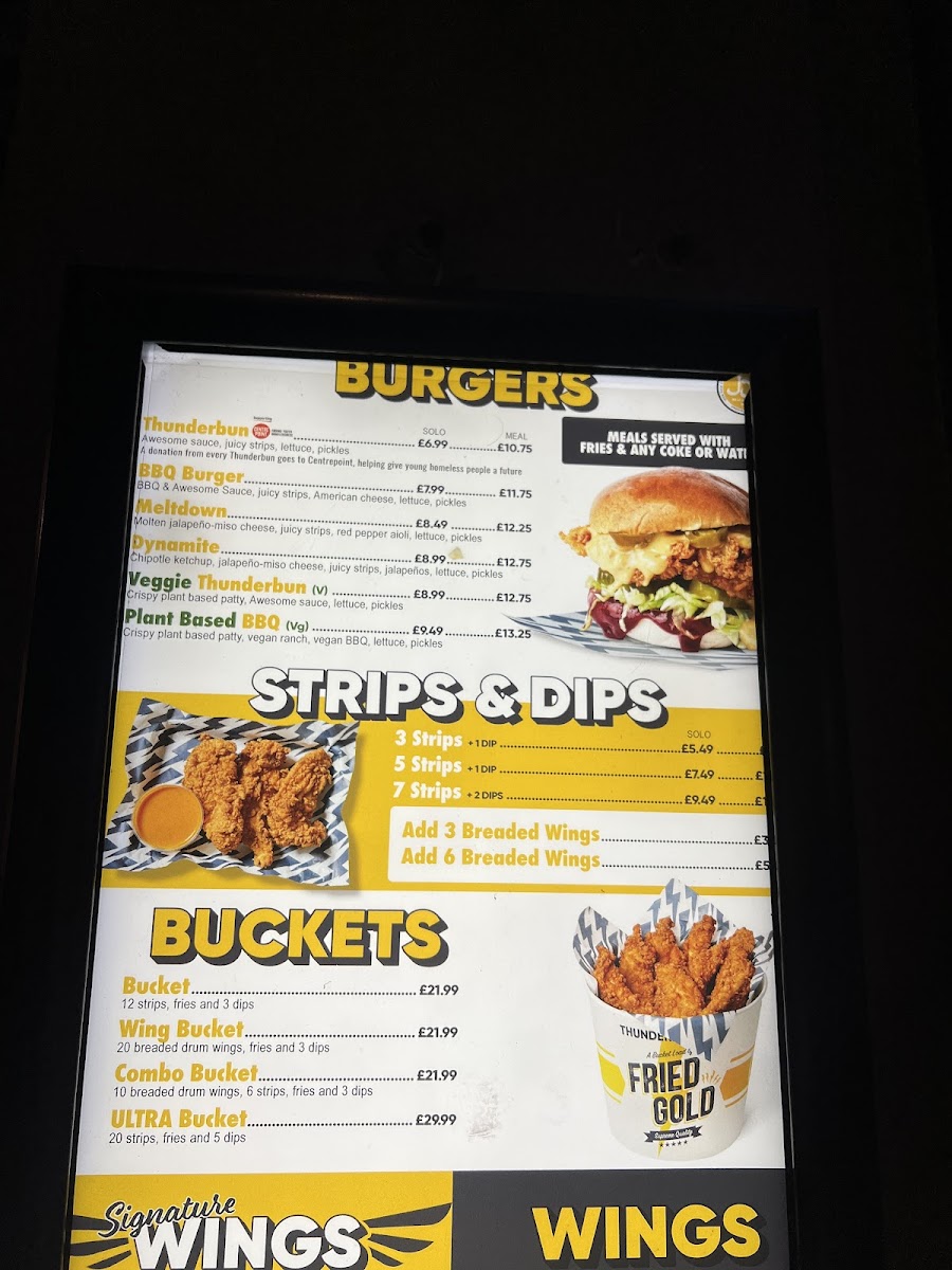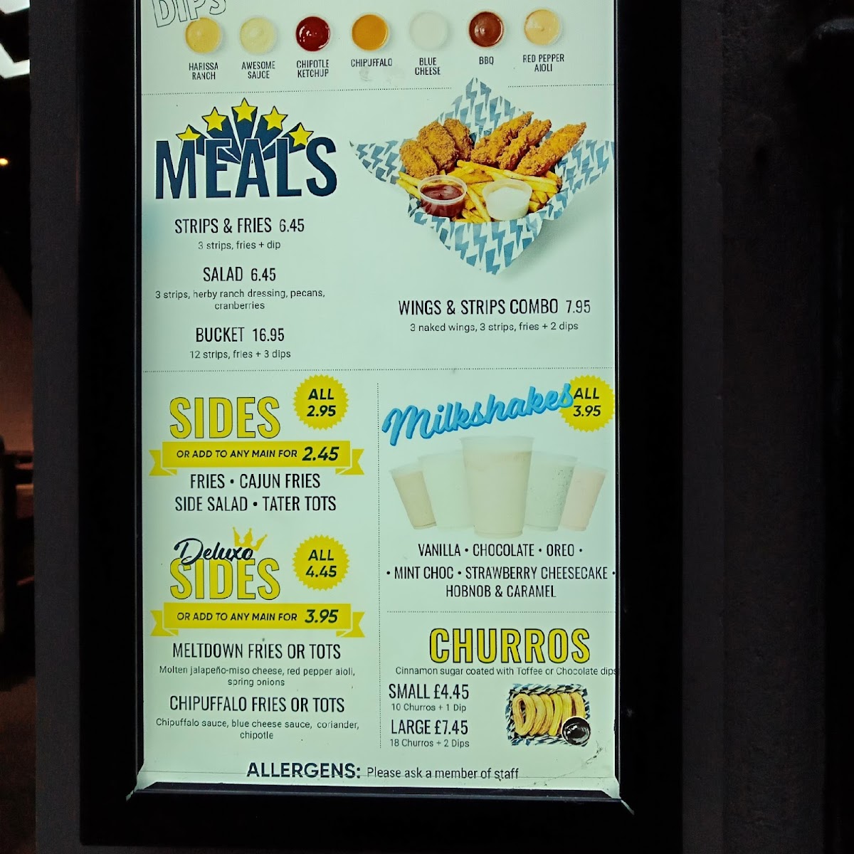 “ Amazing burgers, straps and wings. We randomly hit this place and wow we really loved the food here. We ordered Barbecue burger, Veggie thunderbern, sides, 6 wings, meltdown fries and meal comes with fruit shoot orange. Their Burgers were amazing. Chicken was succulent and juicy with delicious batterand dripping sauces. Even sides were quite tender and juicy. Lastly the wings, oh man, amazing wings and felt like fresh wings were fried and again sauces were addictive (we had tried Korean style barbecue wings) Orders were filled quite quickly. It's a self ordering system. One interesting things was their toilets are also access controlled through a pass code which you get from reception. Cost: A full on dinner for 4 costed 54 pounds which is a bit pricey but worth it. ”